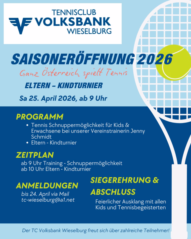 Am 02. und 03. Mai 2026 lädt der TC Volksbank Wieselburg zum zweiten Kids- und Jugendturnier ein. Spielbeginn ist jeweils um...